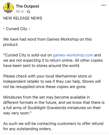 Zu keinem Zeitpunkt wurde dies vorgeschlagen Verfluchte Stadt war eine limitierte Version. Sicher, wir hatten die ersten Probleme am Veröffentlichungstag, als das Spiel superschnell online ausverkauft war. 1 Stunde und 15 Minuten für den britischen GW-Standort, bevor er weg war. Schneller bei den meisten Drittanbietern. Vor der Veröffentlichung gaben mehrere Kontakte in FLGS-Filialen an, dass sie auf nur 30 Exemplare beschränkt waren.